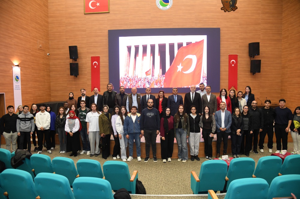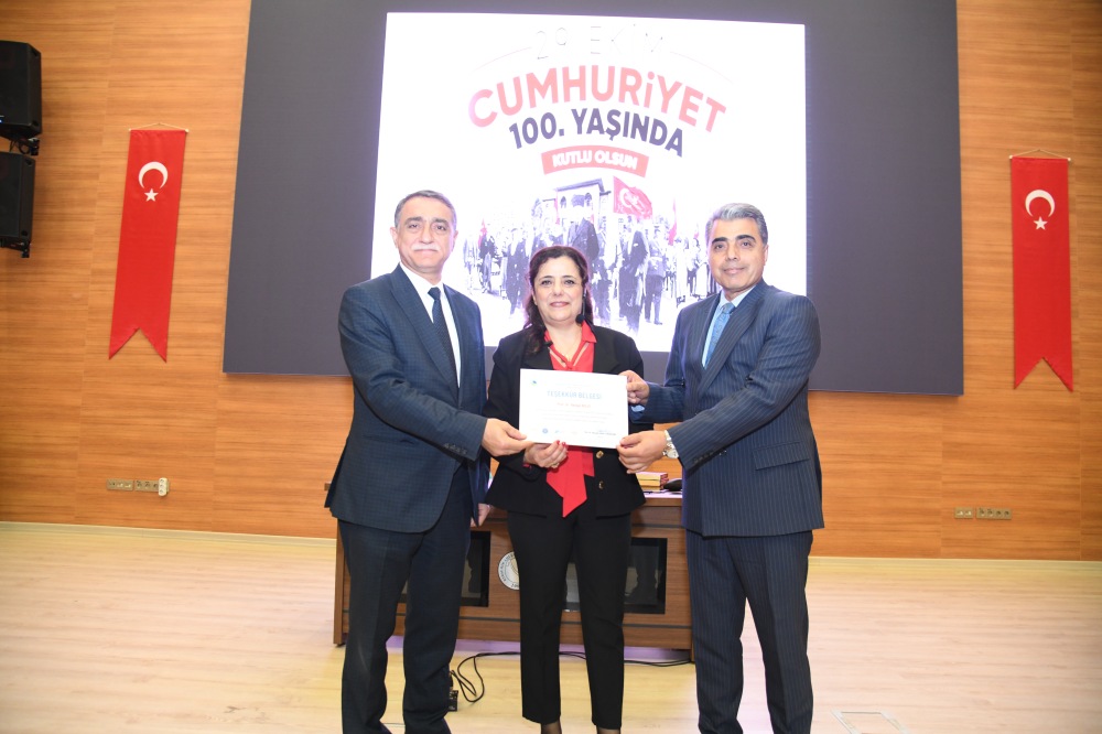 Üniversitemizin Cumhuriyet Bayramı etkinlikleri kapsamında düzenlenen konferansta, Tarih Bölümü öğretim üyemiz Prof. Dr. Bengül Bolat "Cumhuriyete Giden Yol ve Kutlamalar" başlıklı bir sunum gerçekleştirdi.