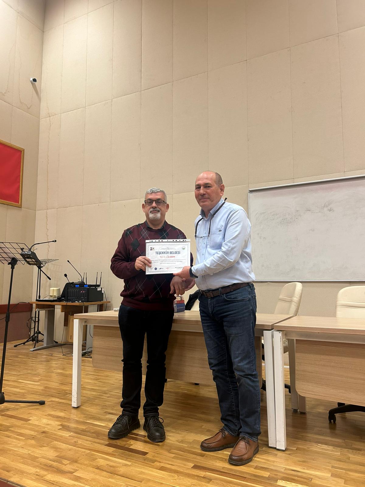 Program sonunda Prof. Dr. Ali Ulvi Özdemir’e, Bölüm Başkanımız Prof. Dr. Yaşar Özüçetin tarafından teşekkür belgesi takdim edildi. Etkinlik, öğretim üyeleri ve öğrencilerin katılımıyla toplu fotoğraf çekimi ile sona erdi.